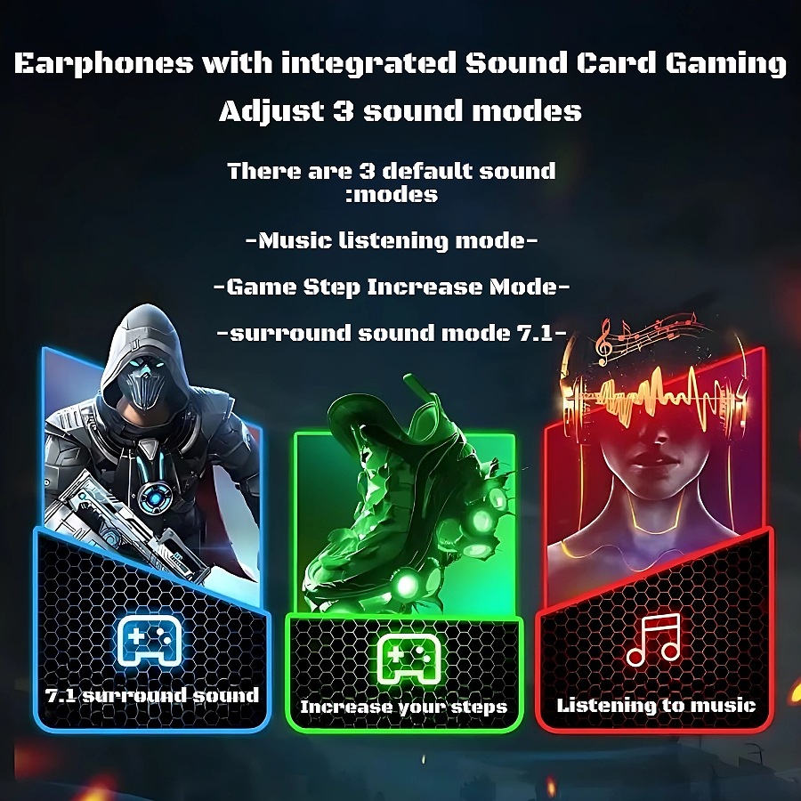 _الوضع 3: صوت محيطي 7.1 (ضوء أخضر)•ميكروفون عالي الجودة لإلغاء الضوضاء، ميكروفون متعدد الاتجاهات مع تقنية متقدمة لإلغاء الضوضاء