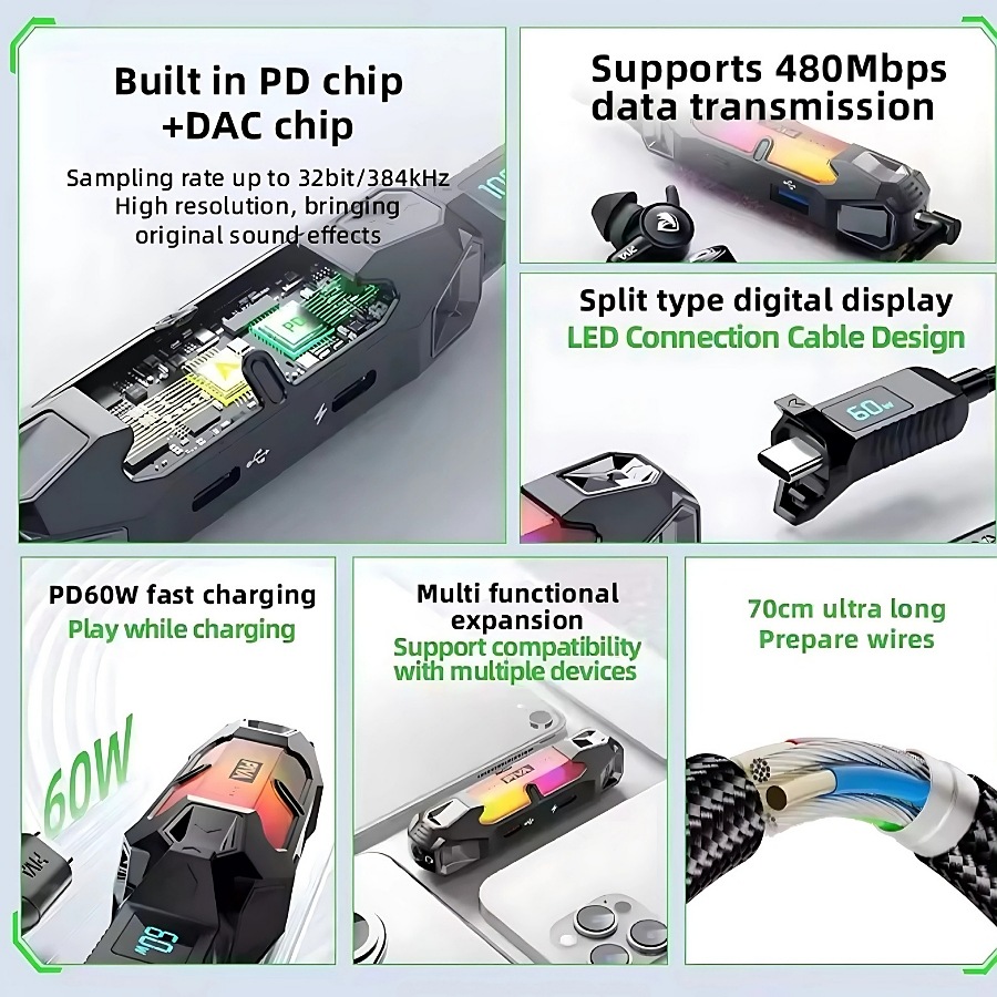 محول بطاقة صوت متعدد الوظائف (4 في 1) مصمم خصيصا لتحسين تجربة الألعاب والصوت على الهواتف المحمولة والأجهزة اللوحية وأجهزة iPad وأجهزة الكمبيوتر المحمولة المزودة بمنفذ من النوع C. فهو يجمع بين الصوت عالي الدقة والشحن السريع 60 واط وخيارات الاتصال الموسعة في جهاز واحد صغير الحجم.