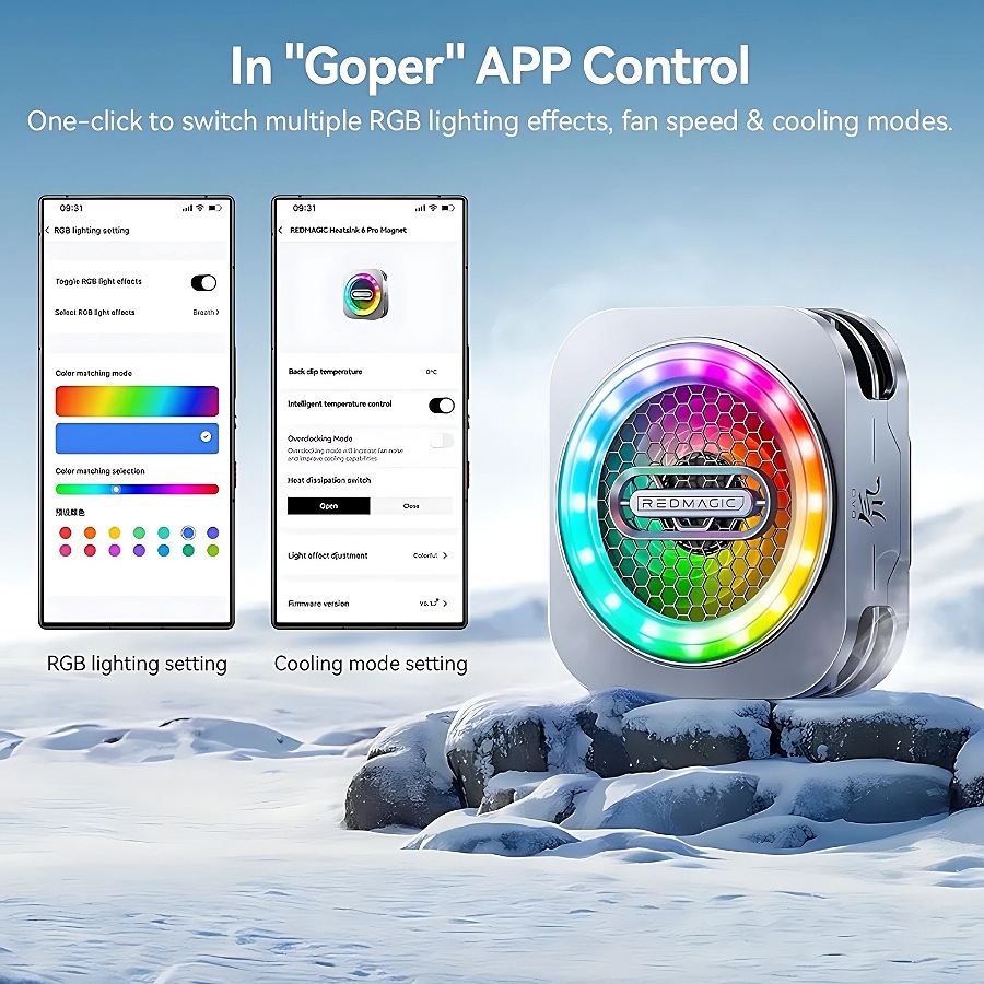 RedMagic 6 Pro Smart Cooler, monitors device temperature and regulates cooling, magnetic, can be attached or clipped, and can be controlled via the Gober app.
