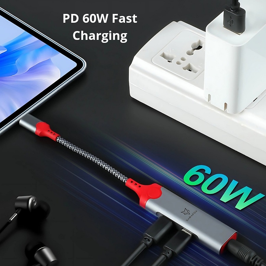 محول سارافوكس 3 في 1، منفذ شحن 60 واط، مقبس سماعة رأس 3.5 ملم ومنفذ Type-C لسماعات الرأس أو الملحقات الخارجية، خفيف الوزن وسهل الحمل، متوافق مع معظم الأجهزة، مناسب للاستخدام العادي أو الألعاب، يوفر مجموعة من تحسينات الصوت، والقدرة على استخدام جميع المنافذ في نفس الوقت.
