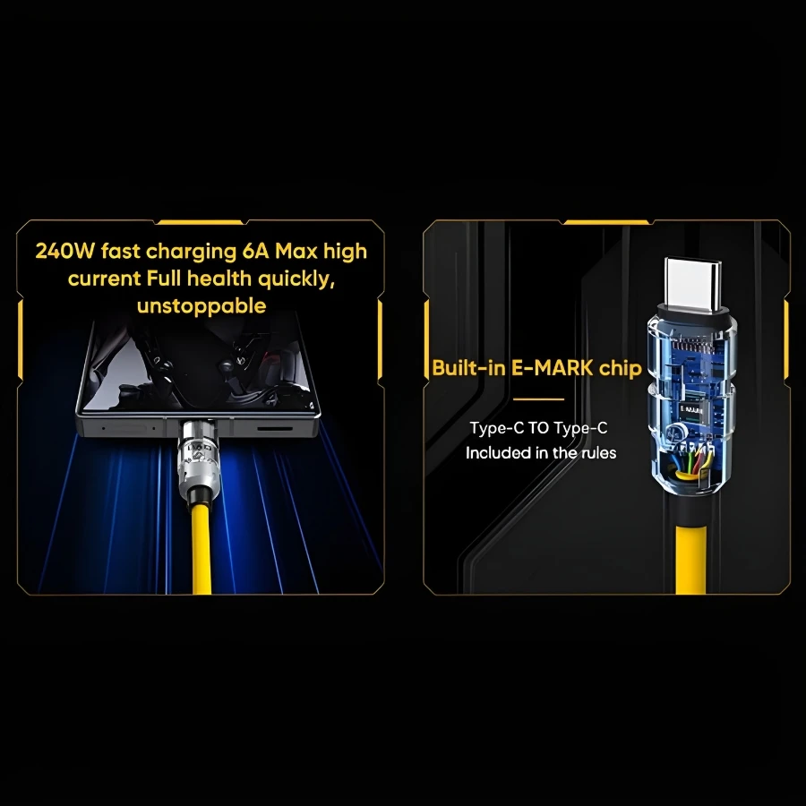 โขThe cable features a built-in smart E-MARK chip, providing intelligent power regulation to ensure safe and optimal power distribution between the device and charger. Made of high-quality silicone, giving it a soft touch with tangle resistance. With a wire thickness of 4.5mm, making it durable and capable of withstanding heavy use.