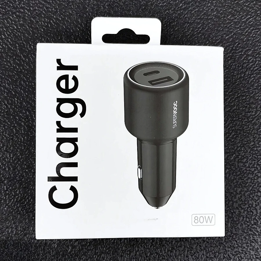 80W car charger with super protection system, compatible with all Oppo, Realme, and OnePlus devices, with a regulation and protection sensor to ensure fast, smooth, and safe charging, with two Type-A and Type-C charging ports, with a system that protects against high temperatures