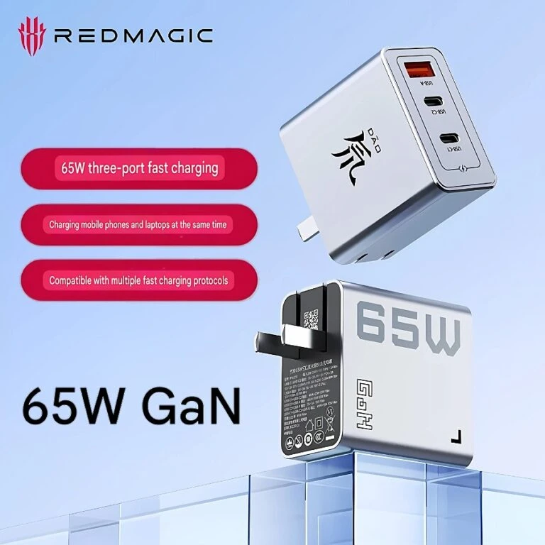 Nubia RedMagic Multi-use Wall Charger, with GAN technology to ensure fast, smooth and safe charging, contains 3 inputs, two 65W Type-C inputs and a 22.5W USB input, compatible with phones, tablets and laptops and supports all charging protocols, small in size and easy to carry