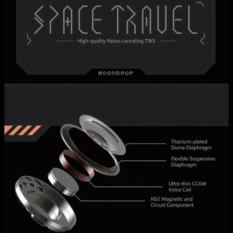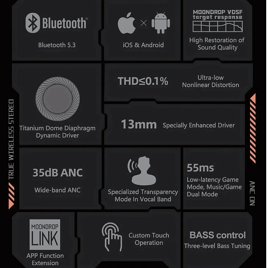 Moondrop wireless earbuds, designed for calls and listening, with a high isolation rate, pure and clear sound with the ability to control it through the application, 3 modes to control the type of amplification, large battery capacity and light weight, Bluetooth 5.3, with noise isolation feature