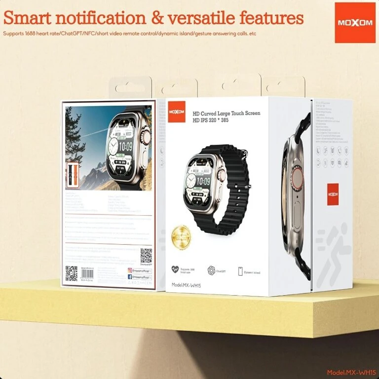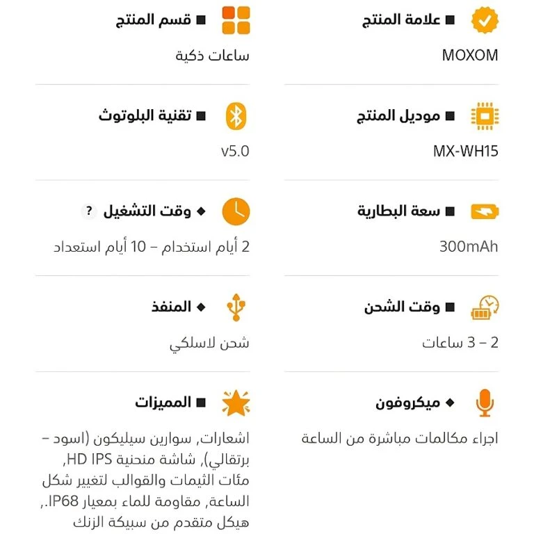 Moxom smart watch, with a curved screen, supports direct dialing and receiving calls, messages and notifications, a 2.02-inch screen, a battery that lasts for more than 7 days on a single charge, a 300 mAh battery, a zinc-coated body, water resistance to the highest standard, and comes with two straps.