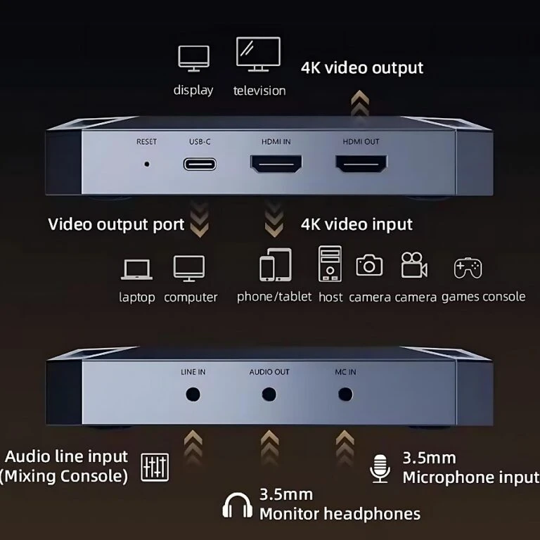 Piva Capture Card Hub, multiple ports and an internal fan for cooling and stable performance. It can connect to an external display of 4k/60hz or 2k/120hz. It has a built-in smart chip that stabilizes performance and prevents lag. Itโs suitable for heavy use and enables all features simultaneously. For streaming and broadcasting, itโs compatible with PlayStation, Windows, iOS and Android phones/tablet.