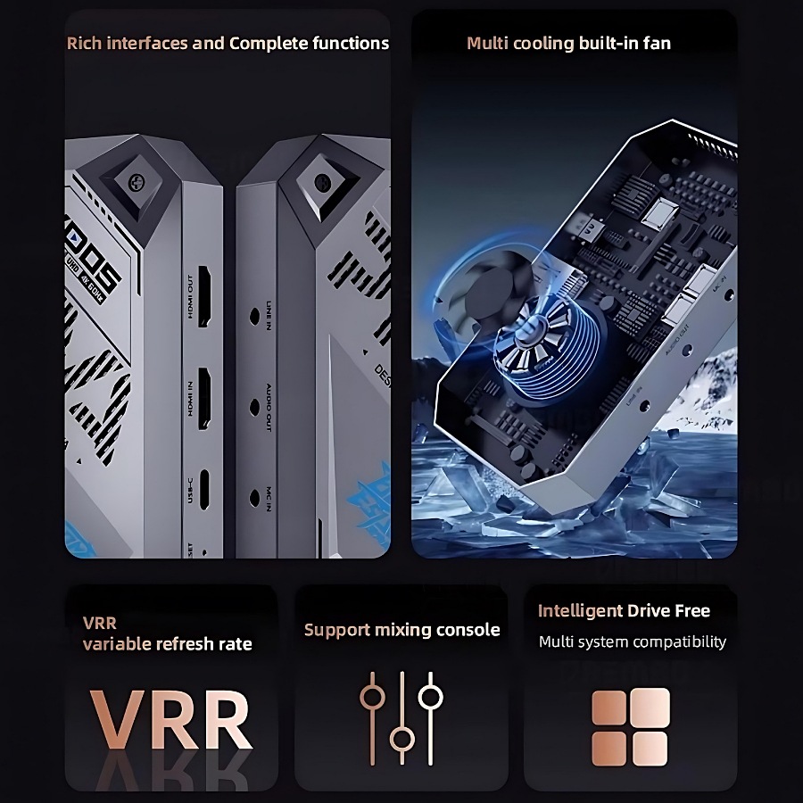 Piva Capture Card Hub, multiple ports and an internal fan for cooling and stable performance. It can connect to an external display of 4k/60hz or 2k/120hz. It has a built-in smart chip that stabilizes performance and prevents lag. It’s suitable for heavy use and enables all features simultaneously. For streaming and broadcasting, it’s compatible with PlayStation, Windows, iOS and Android phones/tablet.