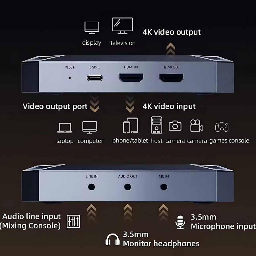 •Audio OUT: 3.5mm port (48KHz/16bit) – Mic IN: 3.5mm port (48KHz/16bit).– Live Support: Up to 4K 60FPS, super sharp image quality for Live Stream Game.