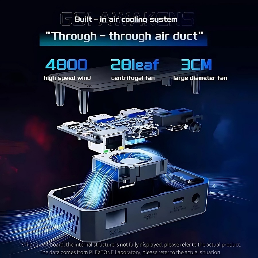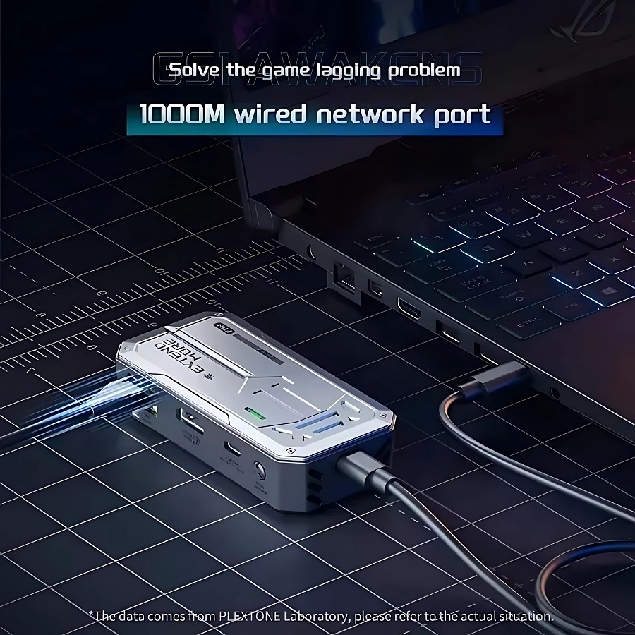 Plextone Awakens Pro Adapter, with multiple ports and an internal fan for cooling and stable performance, the ability to connect to an external 4k/60Hz display, a 1000 mph Ethernet port, with a 100W charging port, suitable for heavy use and enabling all features at once.