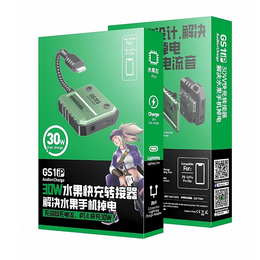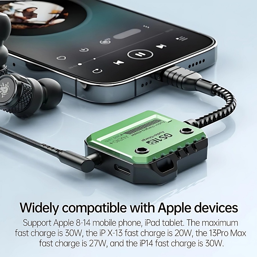 GS1 IP Audio+Charge 30W Fast Charge Headphone Connector 3-in-1 Mobile Phone Sound Card Charging Adapter for iPhone X, 12, 13, 14, Pro Max. This fabric cable adapter is designed for Apple devices, providing a seamless lightning connection for audio and charging. It’s a versatile solution for mobile accessories, offering high-speed charging and audio capabilities in one compact device.