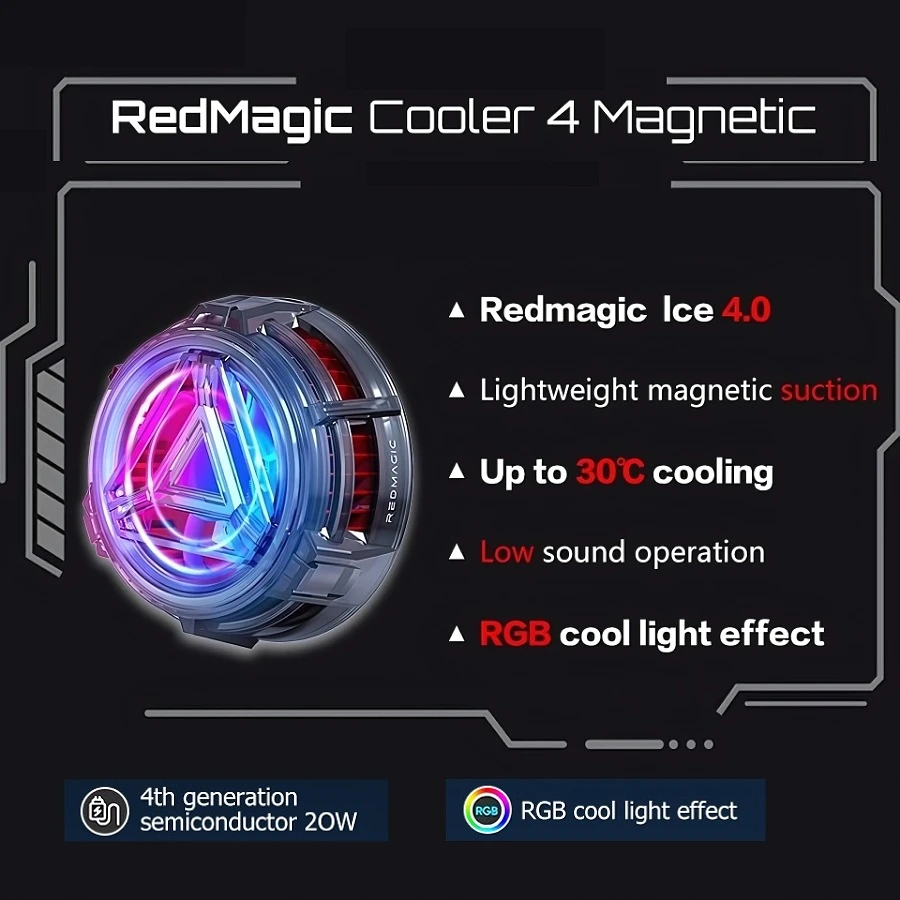 Redmagic 04 magnetic 20w 4th generation semiconductor enverter , up to 30cยฐ cooling 7-blade hight , control from app ( Goper ) RGB