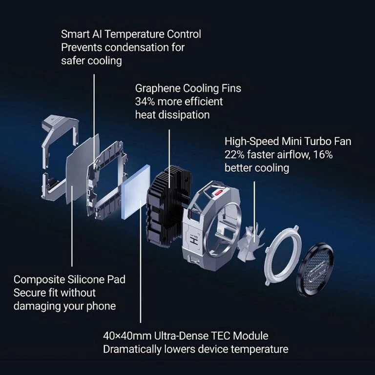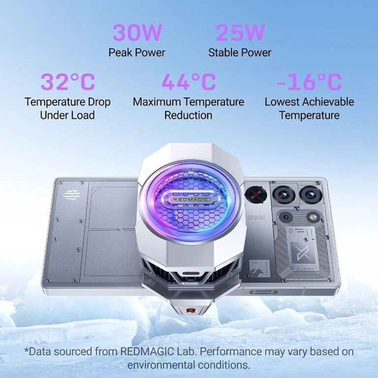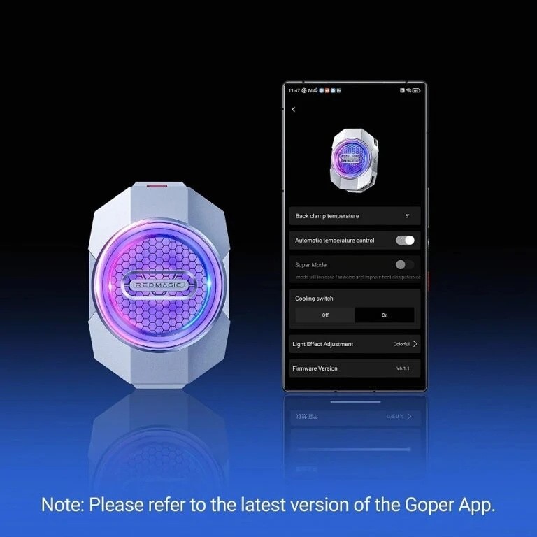 RedMagic 6 Smart Cooler, monitors device temperature and regulates cooling, clips, RGB Lighting Effects, 3D silent airflow,30W Tri-Mode Engine, and can be controlled via the Gober app.
