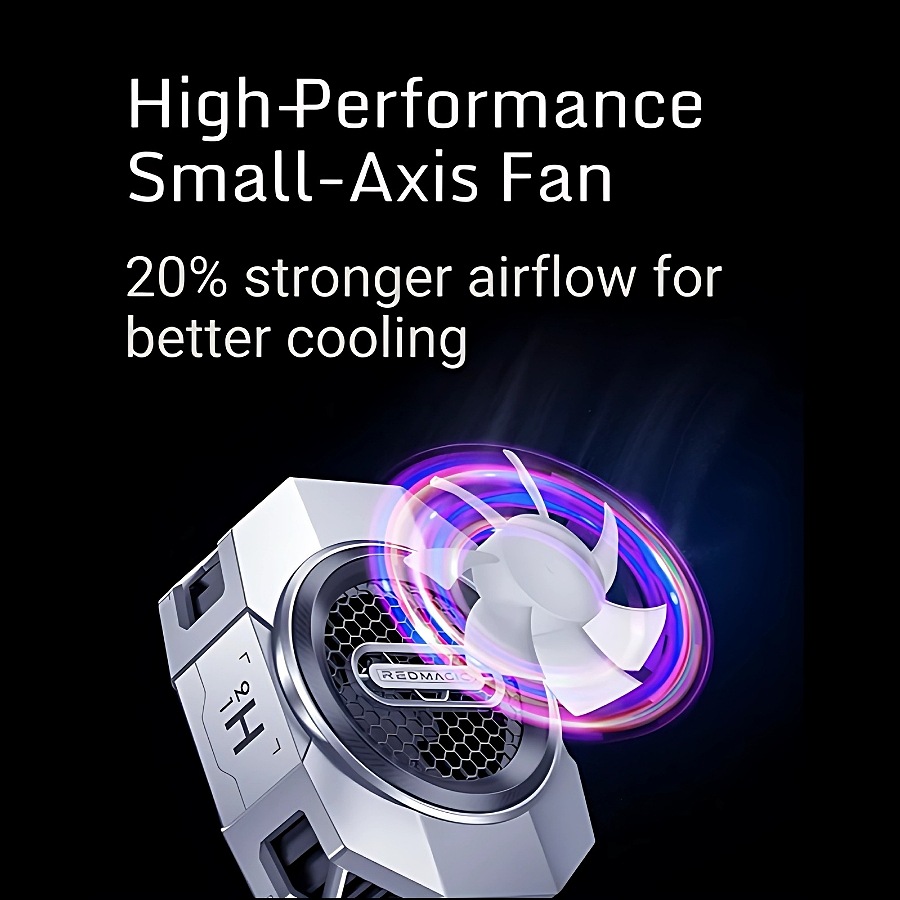 RedMagic 6 Smart Cooler, monitors device temperature and regulates cooling, clips, RGB Lighting Effects, 3D silent airflow,30W Tri-Mode Engine, and can be controlled via the Gober app.