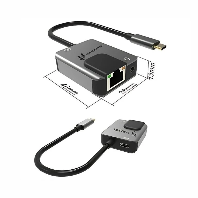Sarafox 3 in 1 adapter, compatible with most devices, contains a 3.5mm headphone jack, a 65W Type-C charging port, and an Ethernet cable port that supports up to 1000 Mbps internet speed, suitable for gaming and other use.