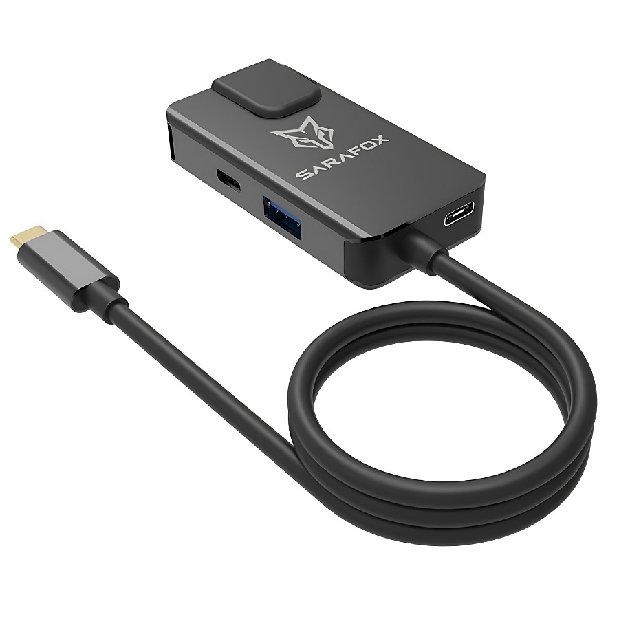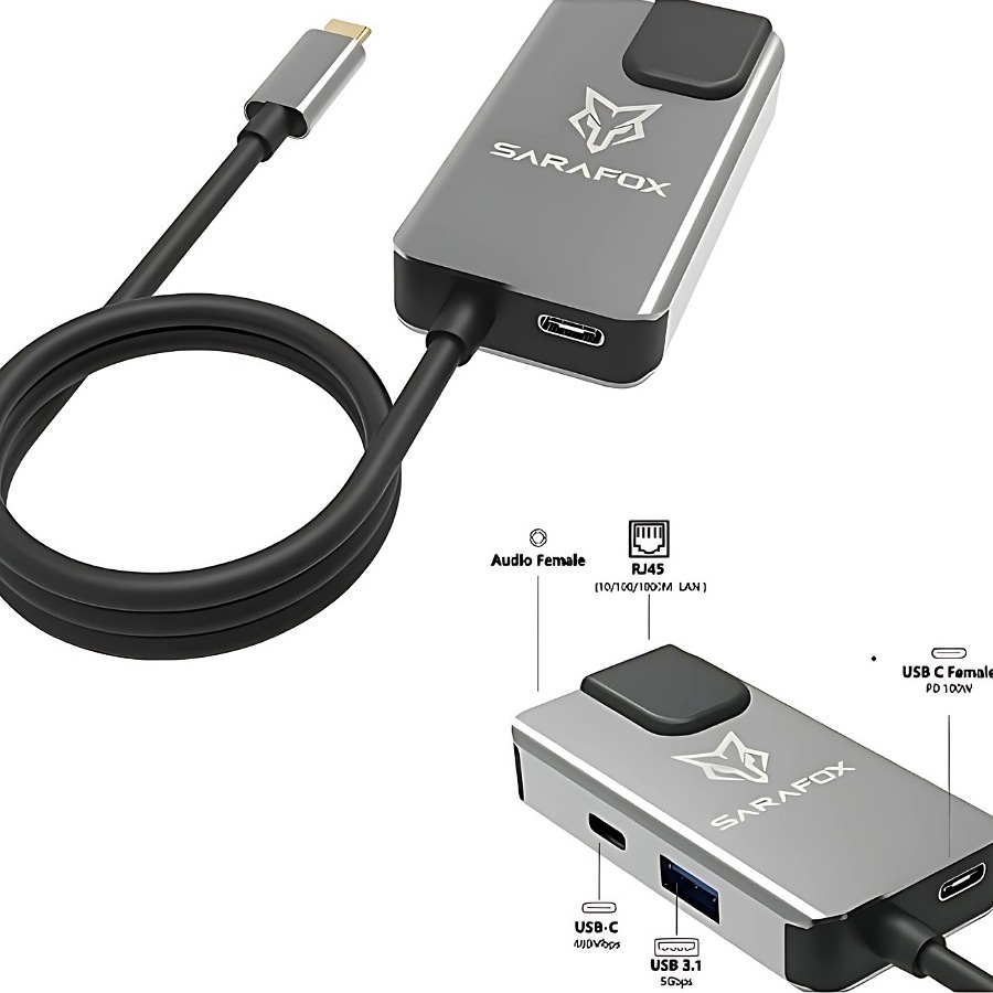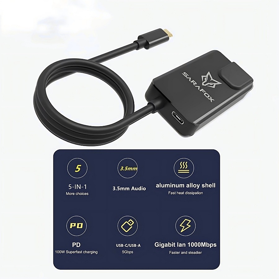 Sarafox 5 in 1 adapter, compatible with most devices, contains a 3.5mm headphone jack, a 100W Type-C charging port, an Ethernet cable port that supports up to 1000 Mbps internet speed, a Type-C port for headphone or data transfer, and a USB port for headphone or any external accessory or data transfer. Suitable for gaming and multiple uses
