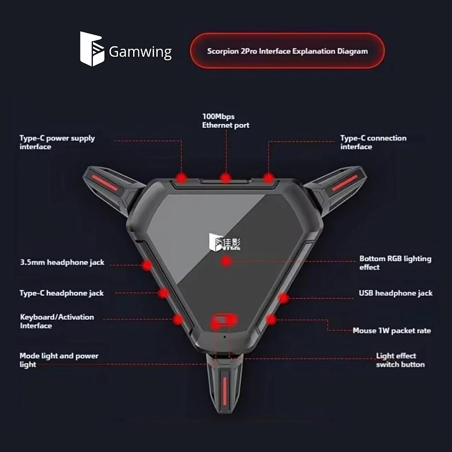 Scorpion 2 Pro Professional Adapter, Possibility of connecting a mouse and keyboard with two USB ports or using Type-C ports, Allows the installation of a 3.5 or Type-C headphone, Interactive lighting control buttons, and a 100W charging port, Supports 2000Hz sensitivity, almost zero latency, with the possibility of connecting to an external screen, Suitable for streamers and multiple uses.