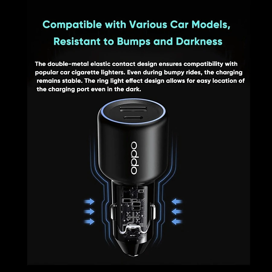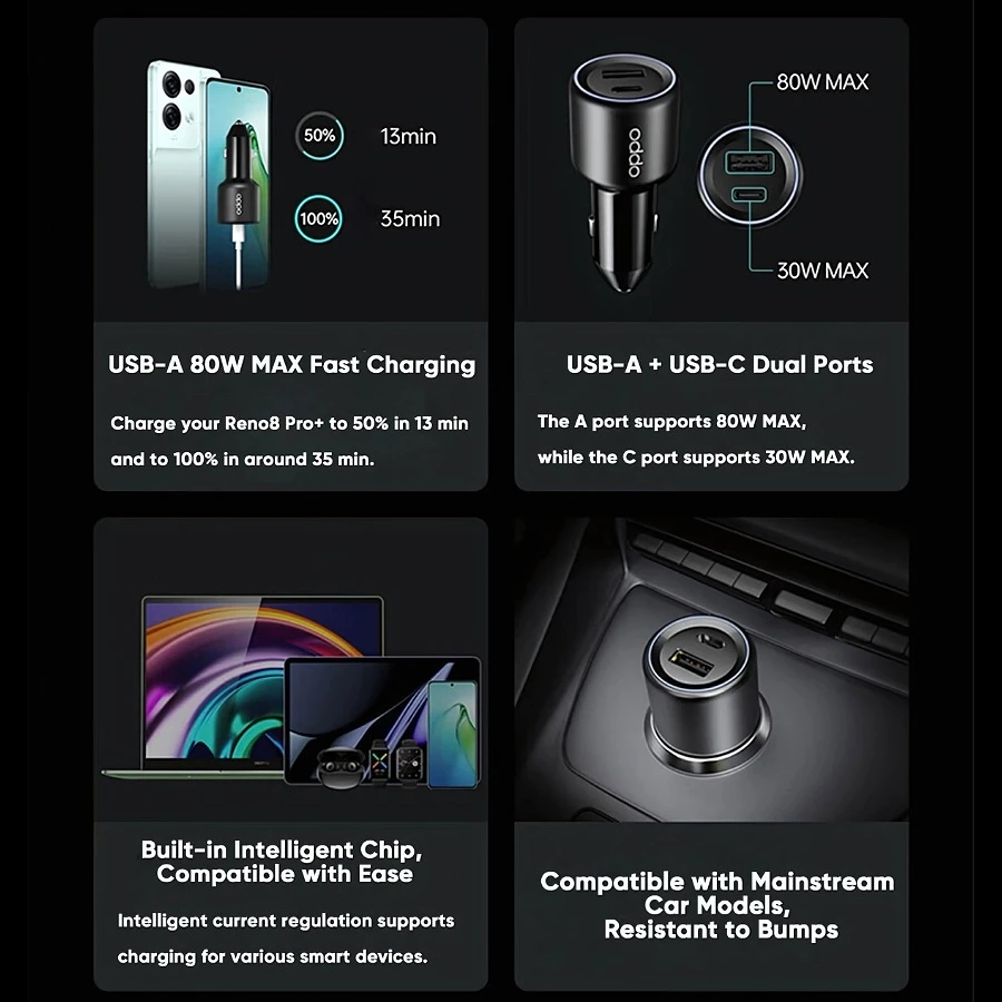 80W car charger with super protection system, compatible with all Oppo, Realme, and OnePlus devices, with a regulation and protection sensor to ensure fast, smooth, and safe charging, with two Type-A and Type-C charging ports, with a system that protects against high temperatures