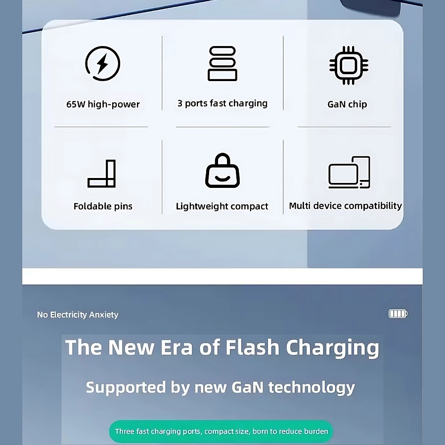 Multi-Purpose Wall Charger, with GAN technology to ensure fast, smooth and safe charging, has 3 ports: two type-C & one type-A. Compatible with phones, tablets, laptop, and switch, supports all charging protocols