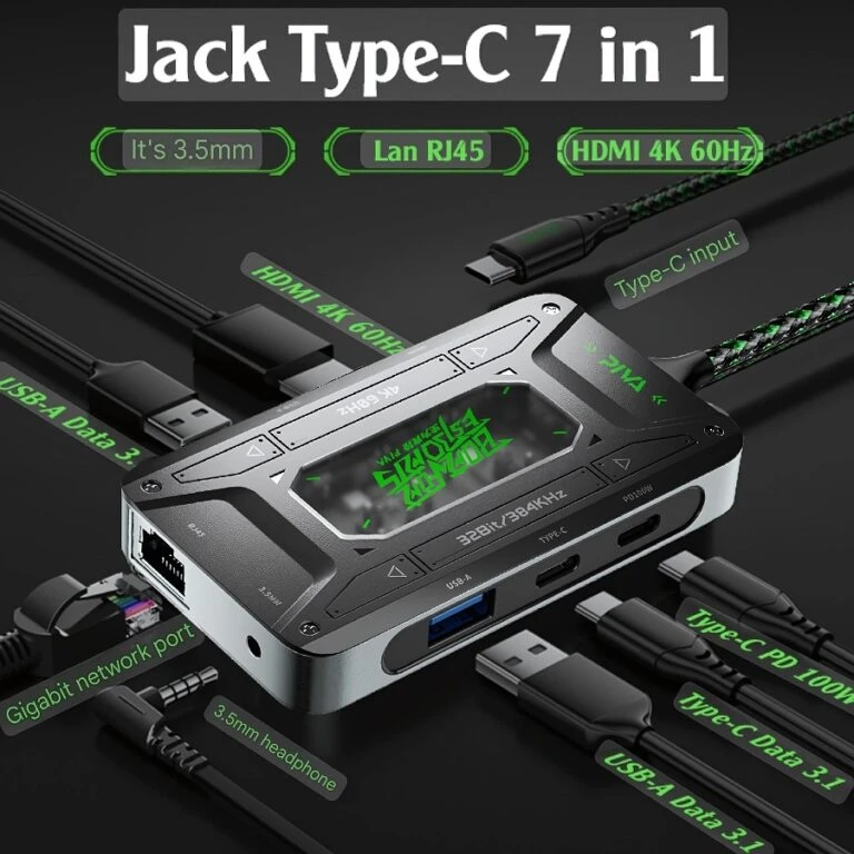 Piva Professional Adapter, Multi-Port for All Uses, 7 Ports, Ethernet Port Supports High Speed, Charging Port Supports Up to 100W, 3.5mm, Type-C or USB Headphone Ports, Used for Data Transfer, Mouse and Keyboard Attachment, and Port to Connect Phone or Computer to an External Monitor. Suitable for Streamers, Broadcasting or Regular Use.