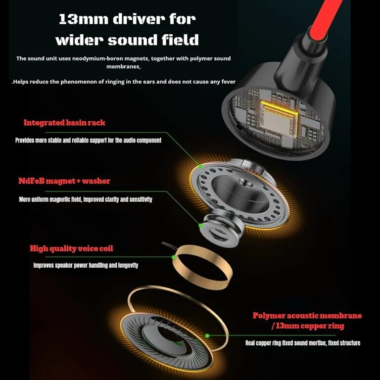 โข A 13mm dynamic driver with a neodymium iron boron diaphragm operates with a frequency response of 20Hz-20kHz, an impedance of 30ฮฉ, and a peak volume of 109dB.