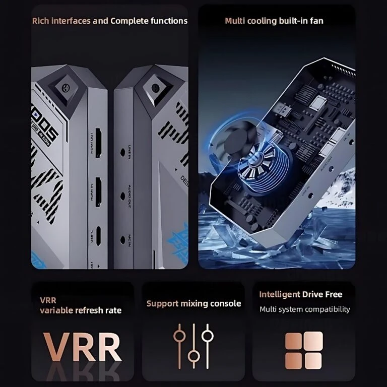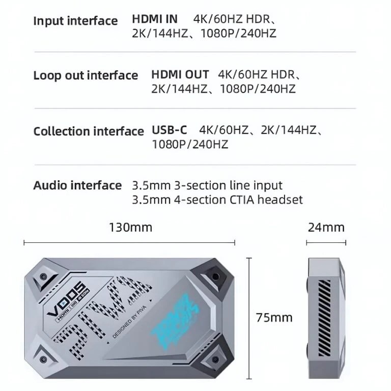 Piva Capture Card Hub, multiple ports and an internal fan for cooling and stable performance. It can connect to an external display of 4k/60hz or 2k/120hz. It has a built-in smart chip that stabilizes performance and prevents lag. Itโs suitable for heavy use and enables all features simultaneously. For streaming and broadcasting, itโs compatible with PlayStation, Windows, iOS and Android phones/tablet.