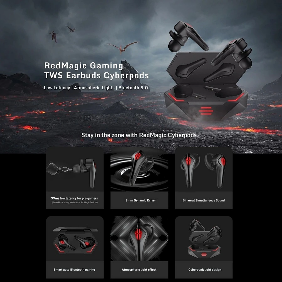 Redmagic Wireless Gaming and Listening earbuds , Ultra Low Latency, Pure Surround Sound and Precise Positioning, Large Battery Capacity and Lightweight, Bluetooth 5.0, with Interactive Lighting