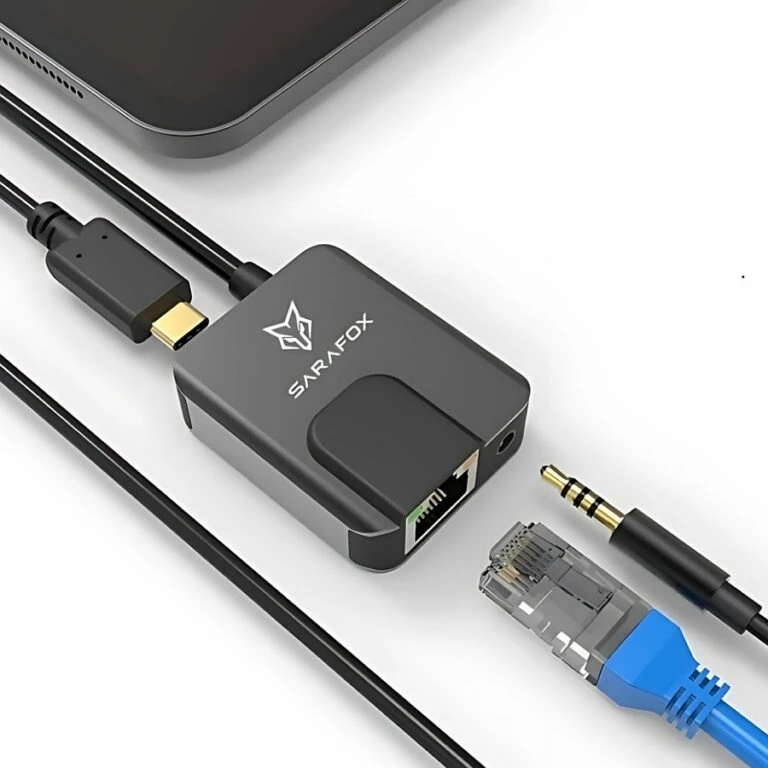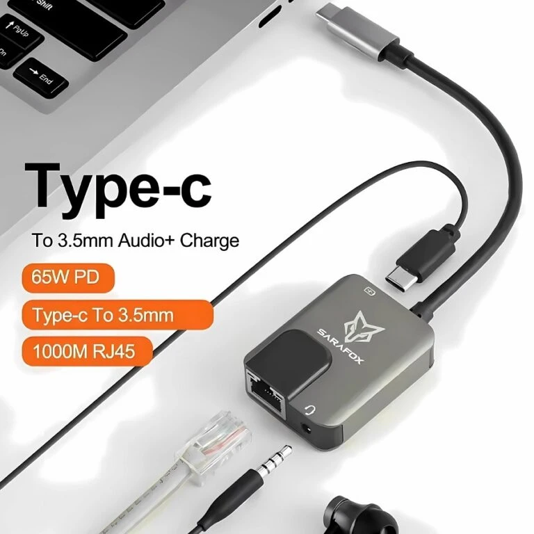 Sarafox 3 in 1 adapter, compatible with most devices, contains a 3.5mm headphone jack, a 65W Type-C charging port, and an Ethernet cable port that supports up to 1000 Mbps internet speed, suitable for gaming and other use.